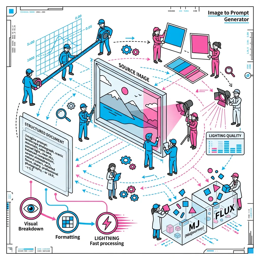 An image to prompt generator analyzes subjects, style, lighting, and composition, then turns them into a structured prompt.